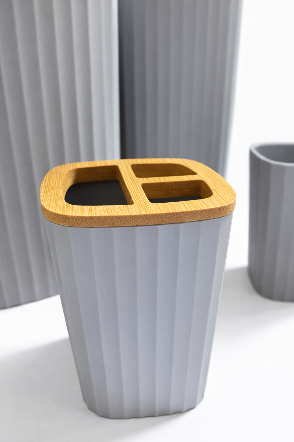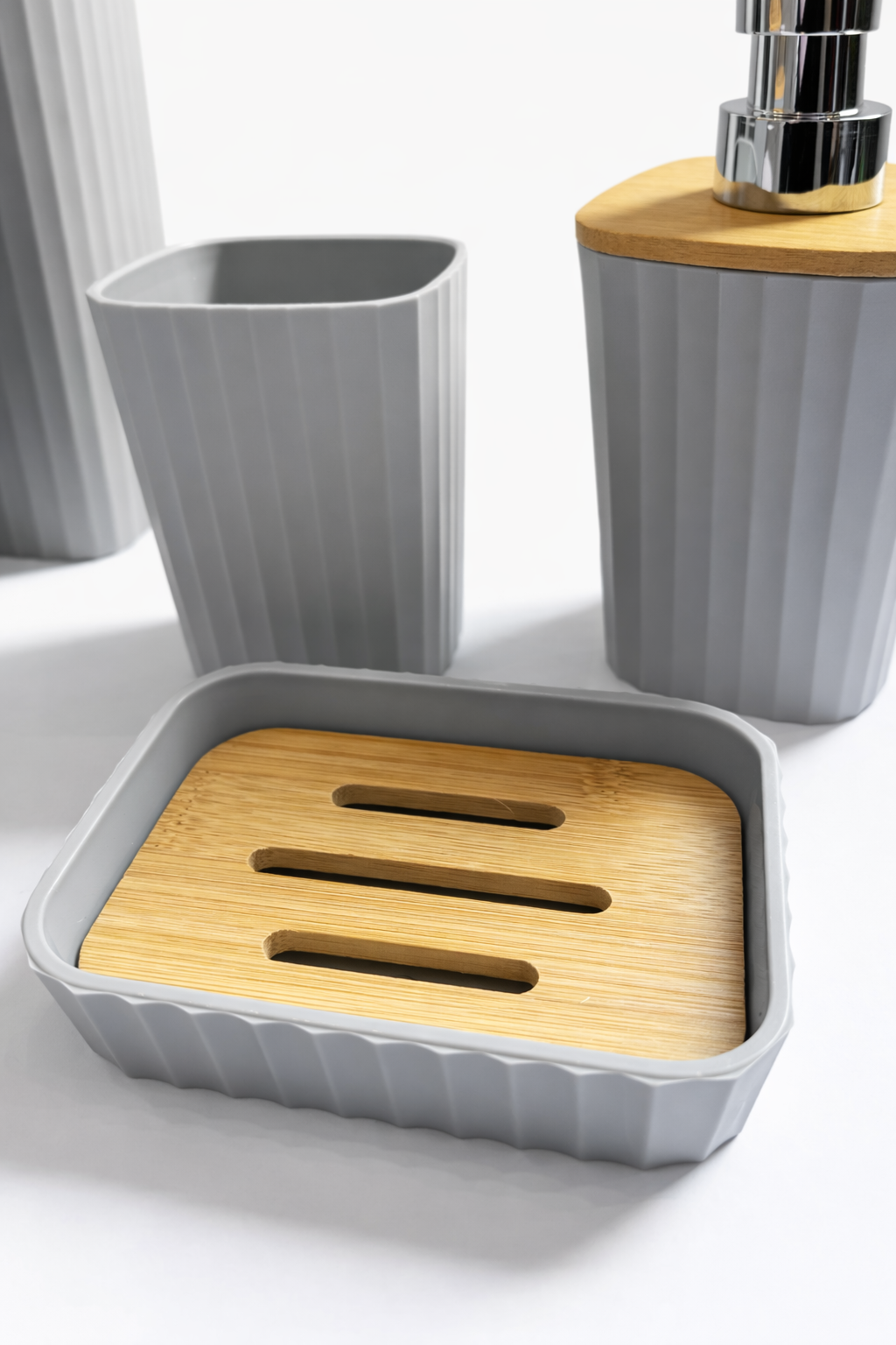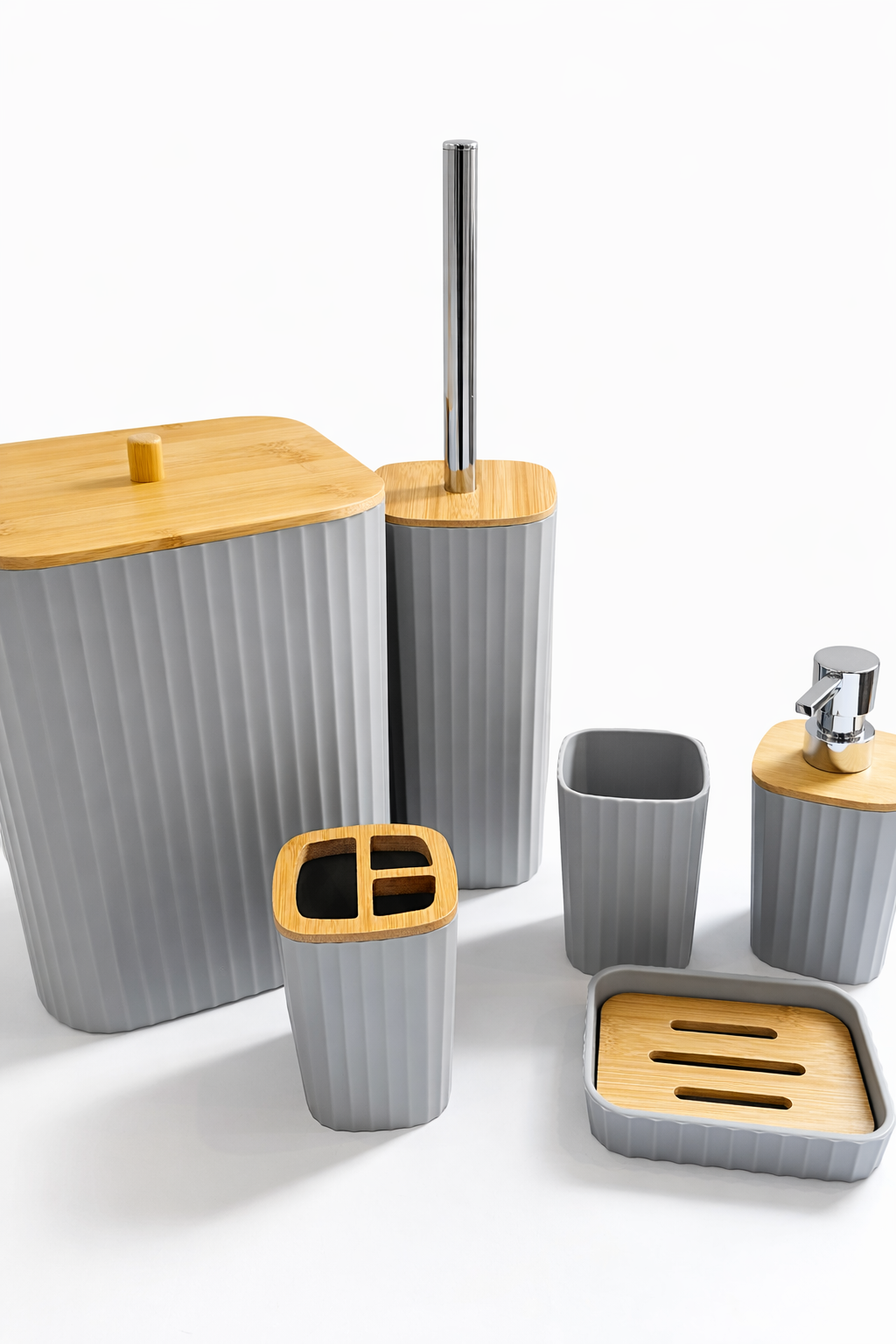 طقم إكسسوارات الحمام الفاخر - رمادي وخشب البامبو